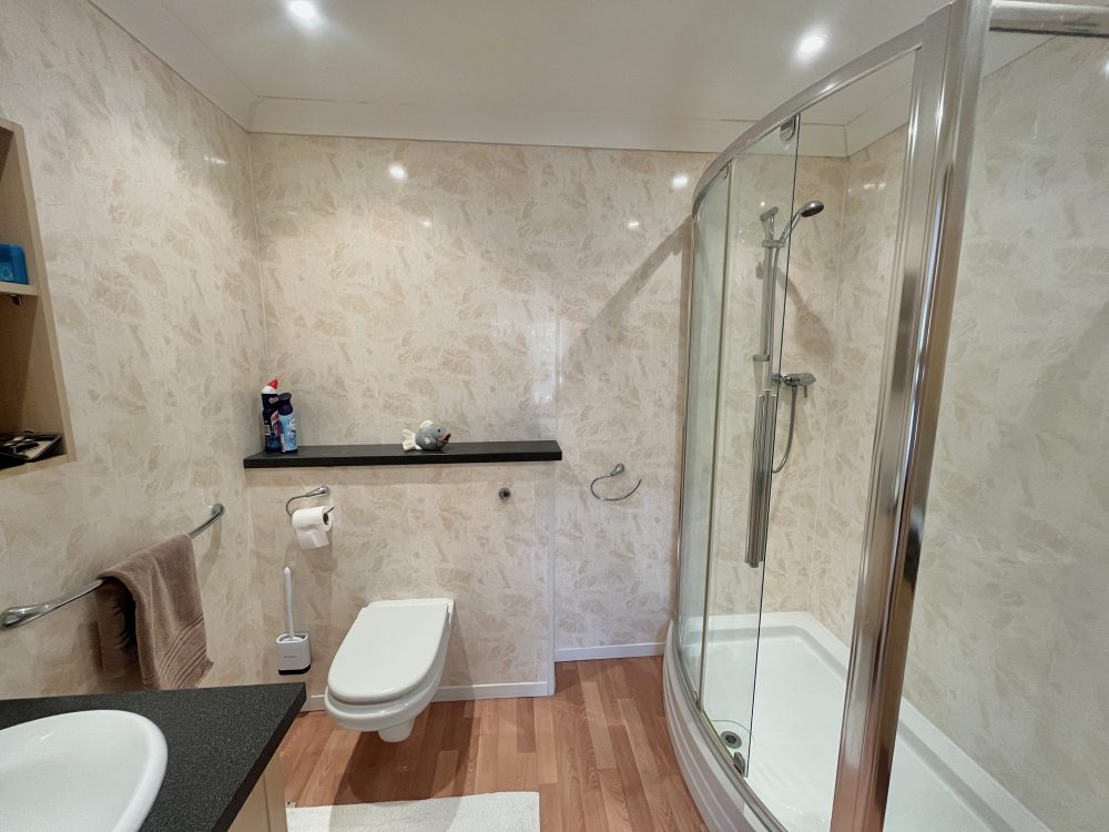 7’11 x 6’1 (2.41m x 1.85m), Shower, hand wash basin, acrylic splash backs, WC, wood style floor.