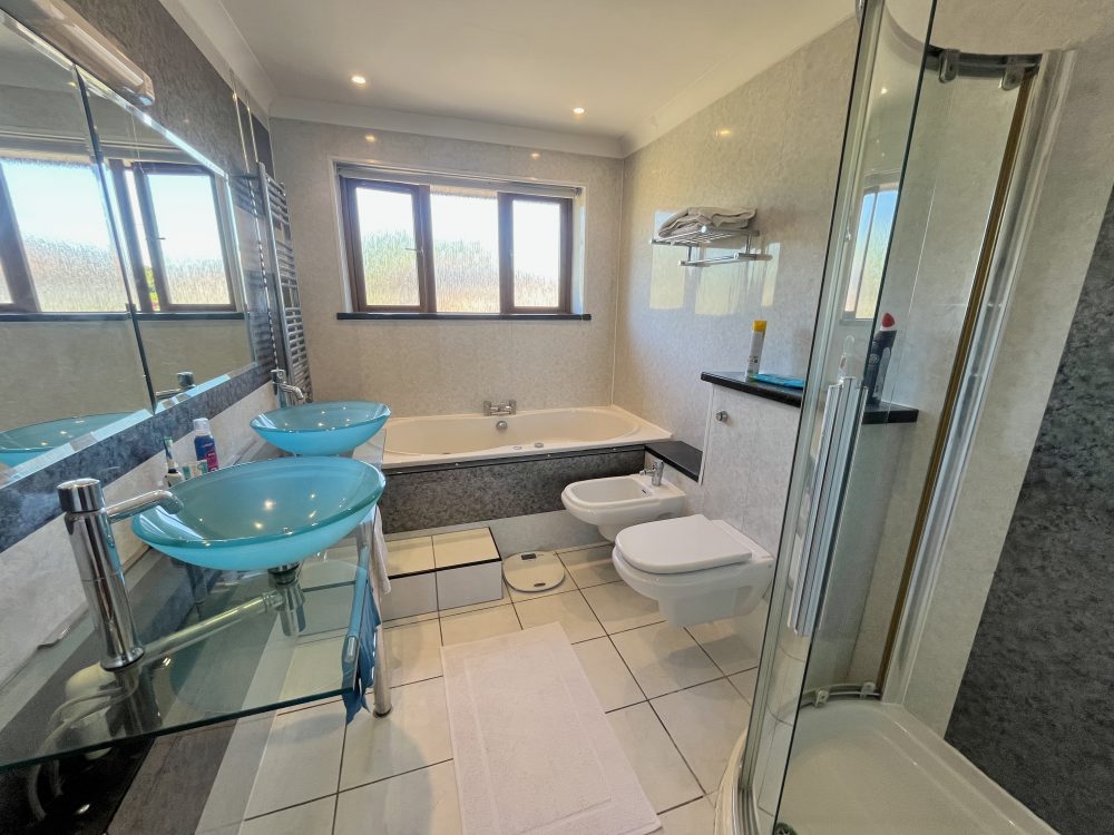 10’3 x 6’11 (3.12m x 2.10m), Jacuzzi bath with separate shower, WC, ‘his’ and ‘hers’ hand wash basins, heated towel rail, tile floor.