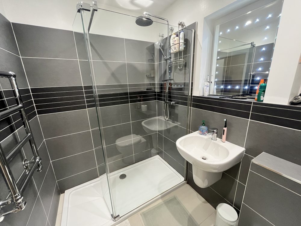 6’11 x 5’5 (2.10m x 1.65m), Large shower with tile surrounds, pedestal style hand wash basin, WC, heated towel rail, cupboard housing water tank, tile floor.