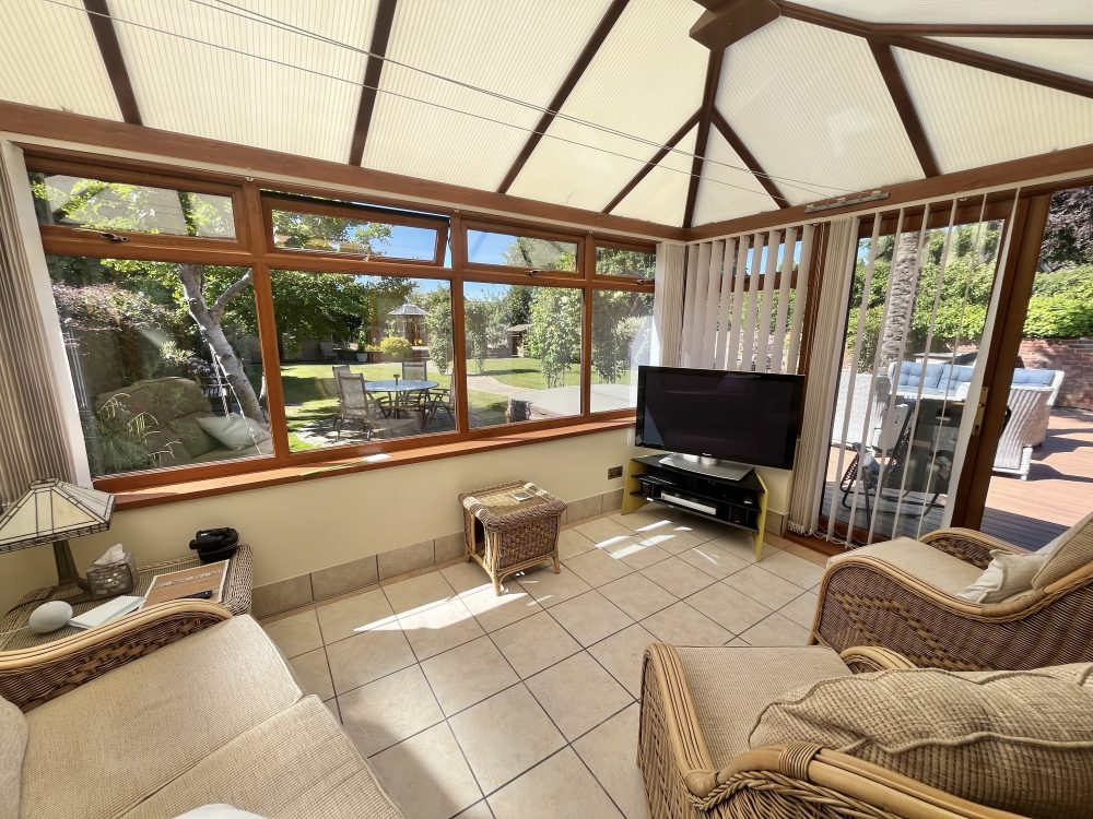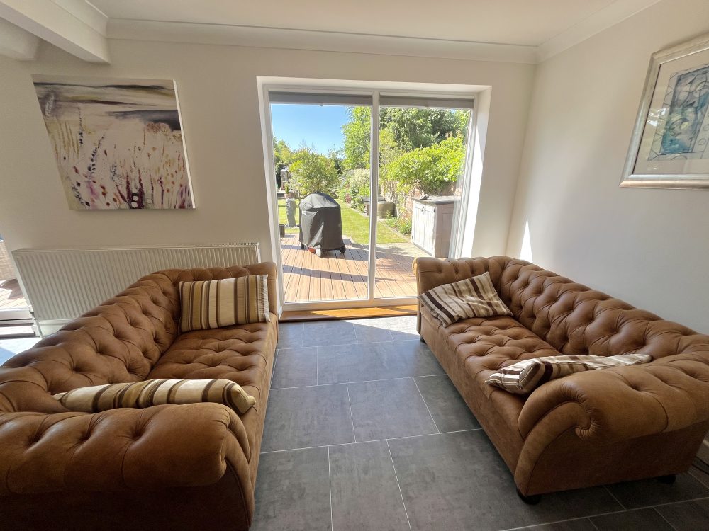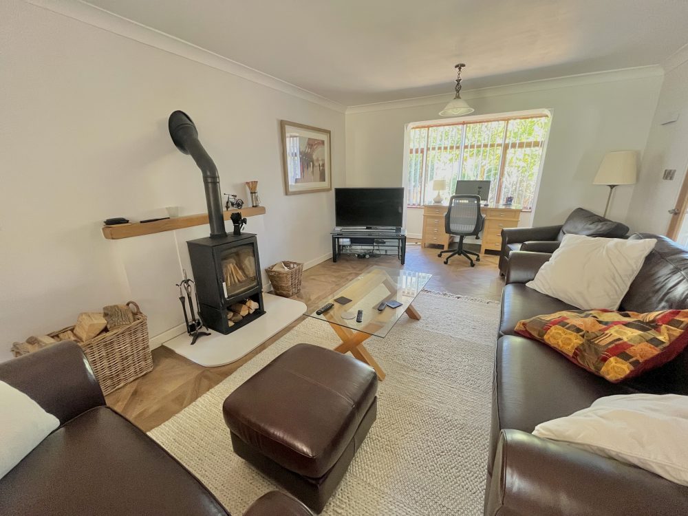 24’4 x 12’5 (7.41m x 3.78m) Maximum Measurements. Log burner and hearth, two radiators, ‘Amtico’ flooring, bi-fold doors to;
