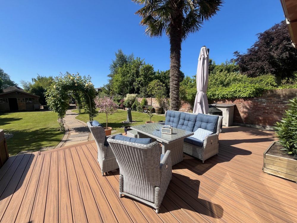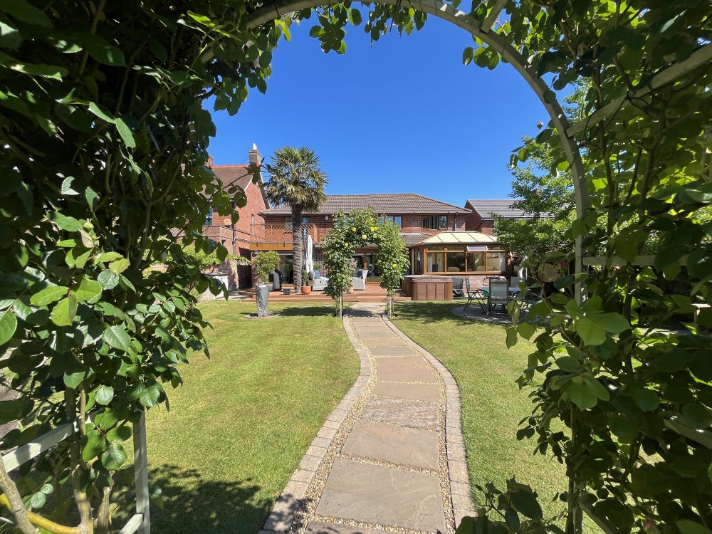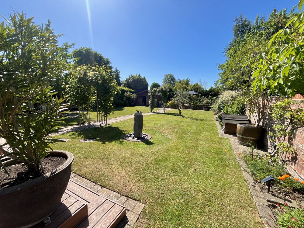 Large rear garden mainly laid to lawn with flower and shrub borders, raised decking and hot tub. Path leading to a raised patio with large shed 14’ x 14’ (4.26m x 4.26m) and Summer house 10’ x 8’ (3.04m x 2.43) . Garden bounded by timber fencing and wall. Paved patio side access.