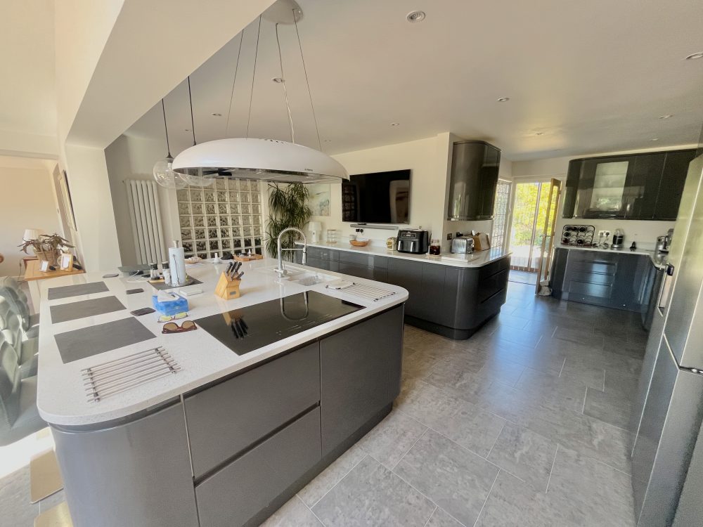 32’6 x 28’ (9.90m x 8.53m)Maximum Measurements. Floor and wall units, quartz worktops with inset sink and drainer. Electric double oven, microwave and hot plate. Electric hob with hood over, Integral dishwasher and space for fridge freezer, door to garage. Opening to dining area with sky light windows, radiator ‘Amtico flooring throughout and bi-fold doors to rear garden.