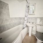 6’2 x 5’7 (1.88m x 1.73m), panel bath with shower attachment. WC, hand wash basin, vinyl style floor, part tiled walls.