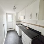 15’ x 5’5 (4.57m x 1.67m), Wall and floor units, sink with drainer and splash backs, worktops, space for washing machine and fridge/freezer. Electric cooker, airing cupboard housing hot water tank. Additional built in cupboard, vinyl style floor and door to outside.