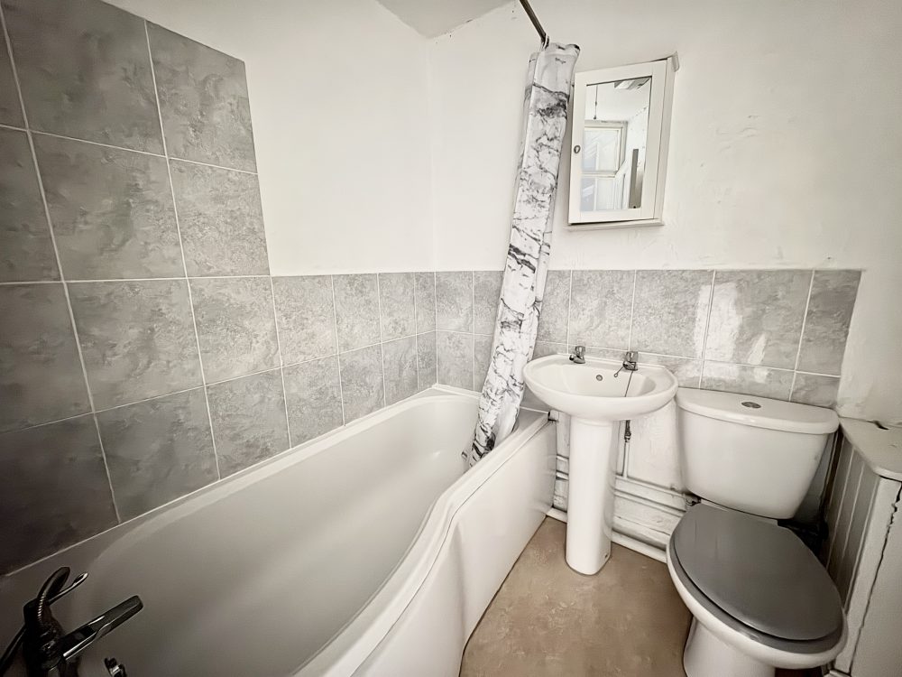 6’2 x 5’7 (1.88m x 1.73m), panel bath with shower attachment. WC, hand wash basin, vinyl style floor, part tiled walls.