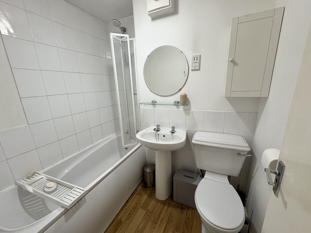 6’6 (1.98m) x 5’10 (1.77m), bath with shower over, wash basin, WC, part tiled walls, wood effect flooring, extractor fan and electric heater.