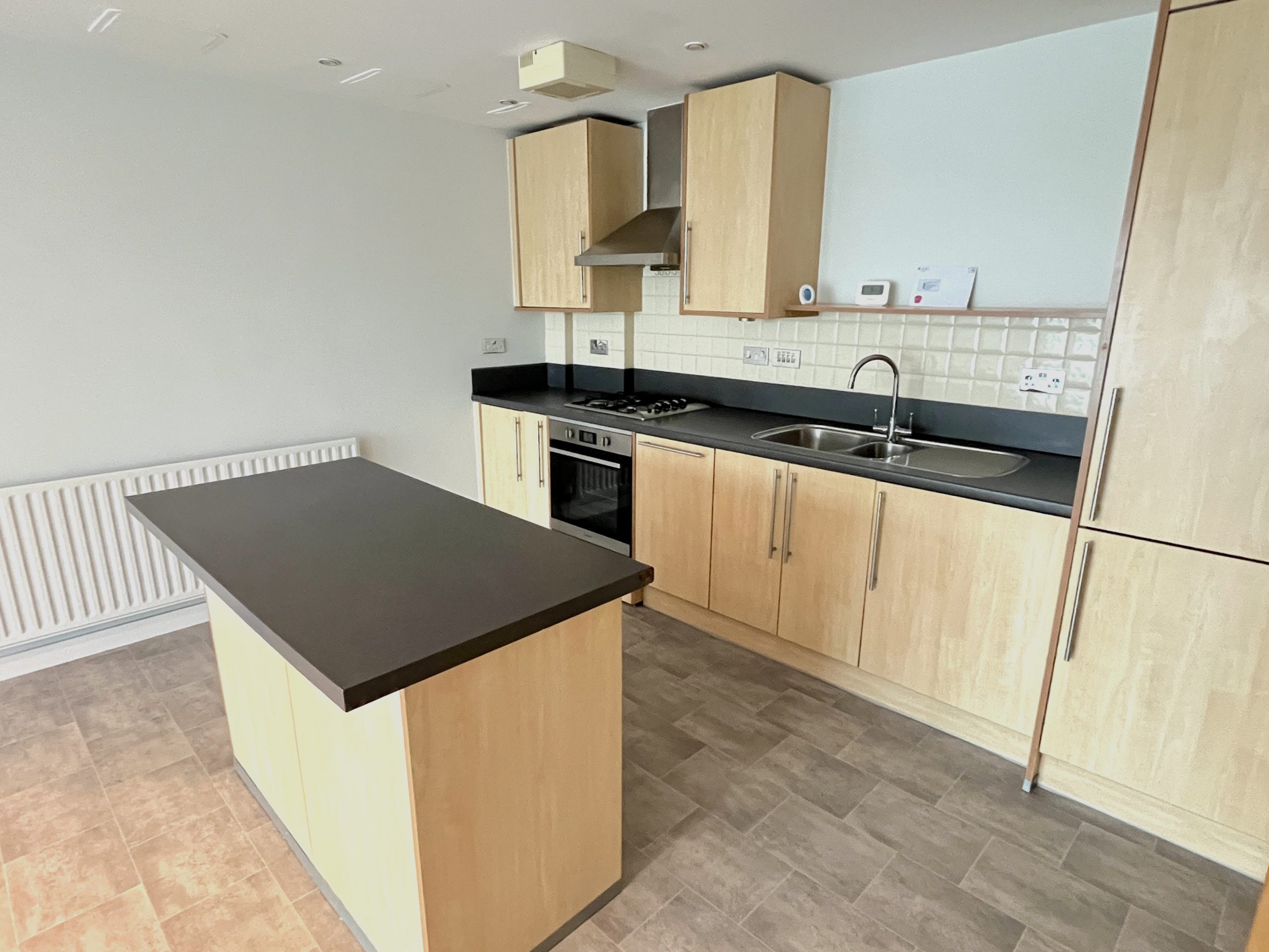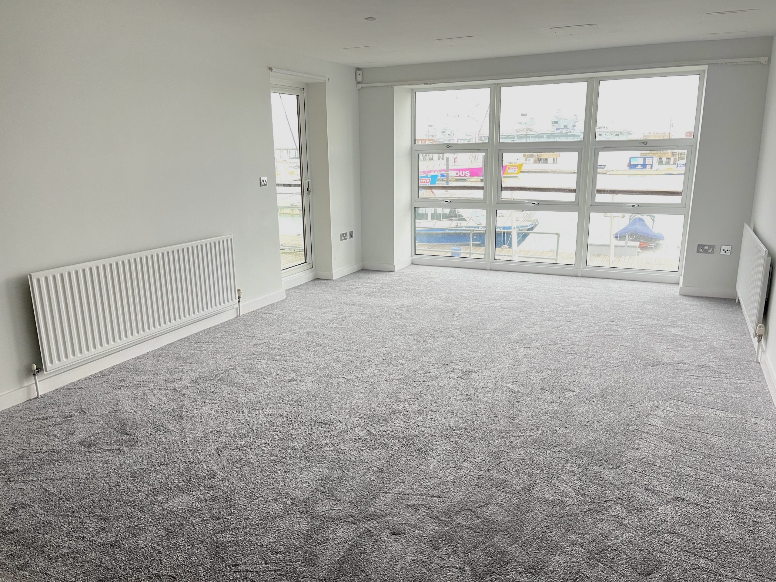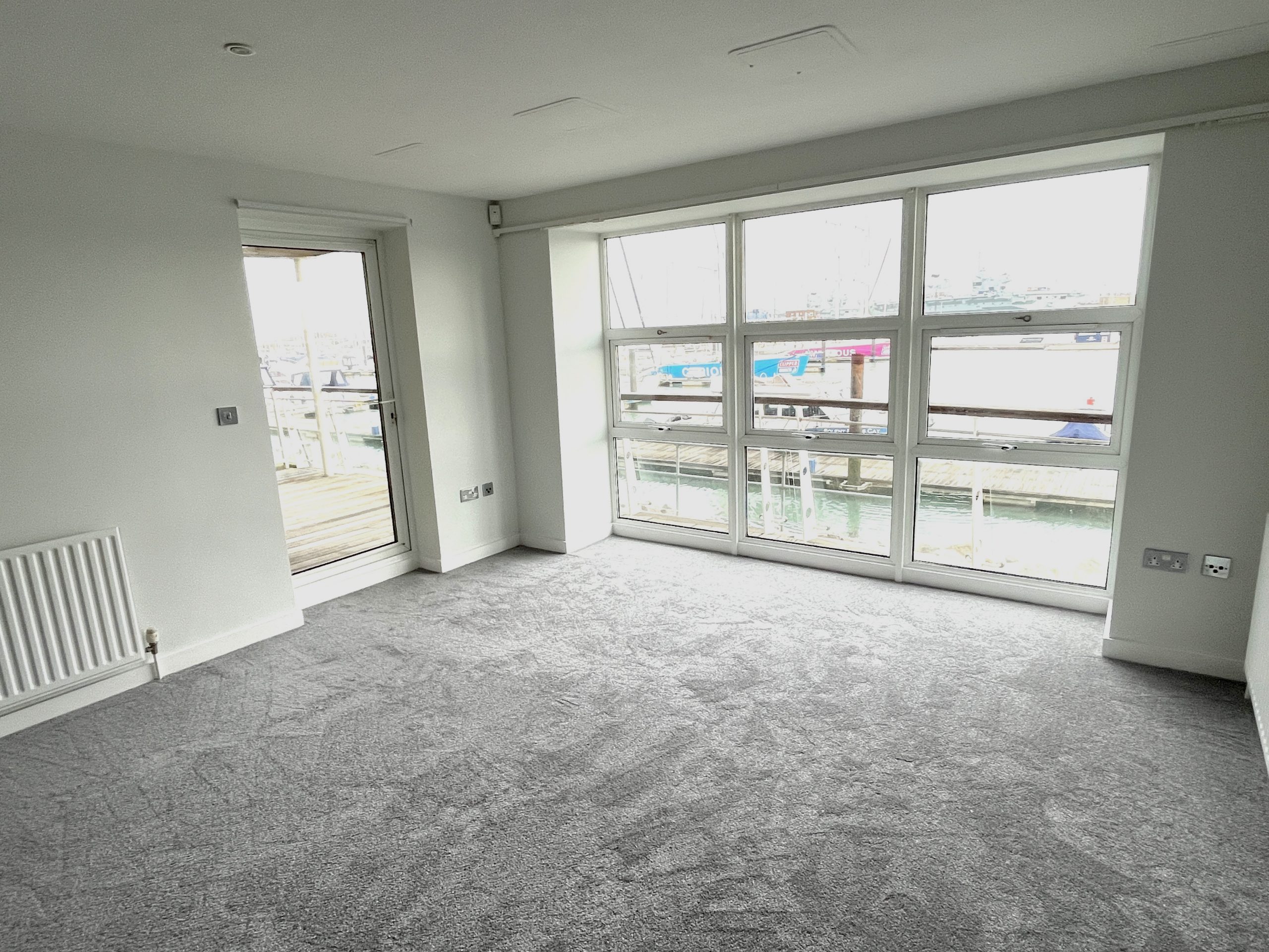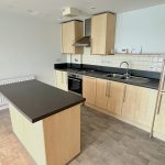 28'5 (8.66m) x 13'4 (4.06m), Wall and floor units, island unit, gas hob hood, oven, cooker hood over. 11/2 sink and drainer, worktops, matching upstands and tiling. 1/2 sized dishwasher, washer/dryer, fridge freezer. Large floor to ceiling widows with harbour views, 3 radiators, door to balcony, spot lighting, new carpet and vinyl to kitchen area.