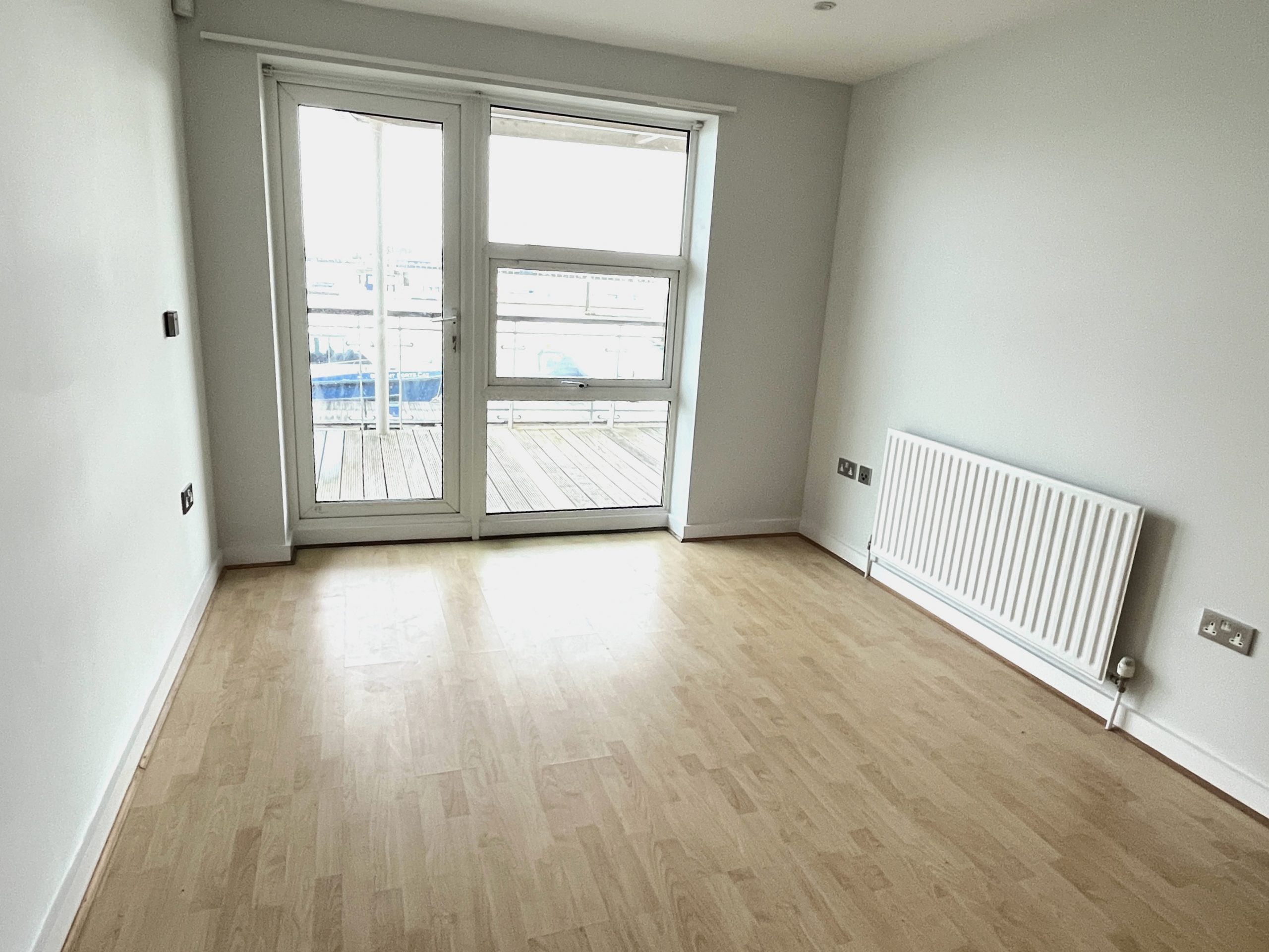 11'8 (3.55m) x 10'7 (3.22m), Large window overlooking harbour, built in double wardrobe, laminate style floor, radiator, spot lighting and door leading to;