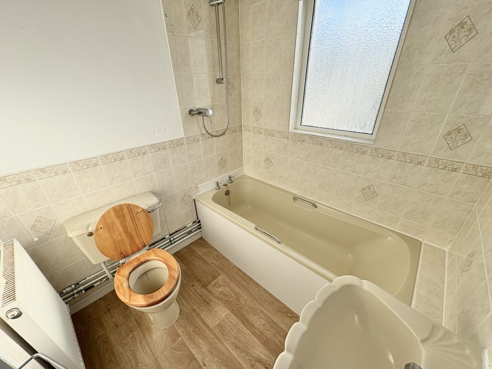 6’01 (1.85m) x 5’10 (1.77m), Panel bath with shower over, hand wash basin, WC, extractor fan, radiator, part tiled walls, vinyl style floor.