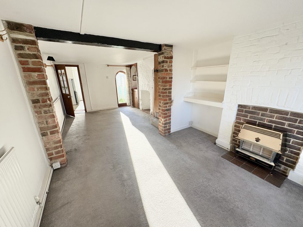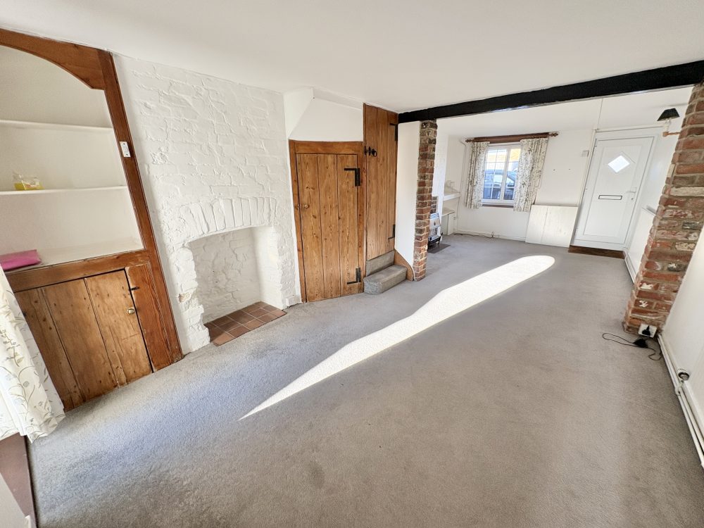 11’01 (3.37m) x 11’00 (3.35m), Feature fireplace with, recessed cupboards and shelving, radiator, carpet, stairs to first floor, door to rear garden, door to kitchen.
