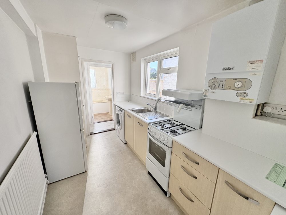 11’01 (3.37m) x 6’06 (1.98m), comprising; Floor units with worktops, sink with drainer, tile surrounds, freestanding cooker, space for washing machine and fridge freezer. Storage cupboard, wall mounted gas fired boiler, vinyl style floor, radiator. Door to;-