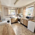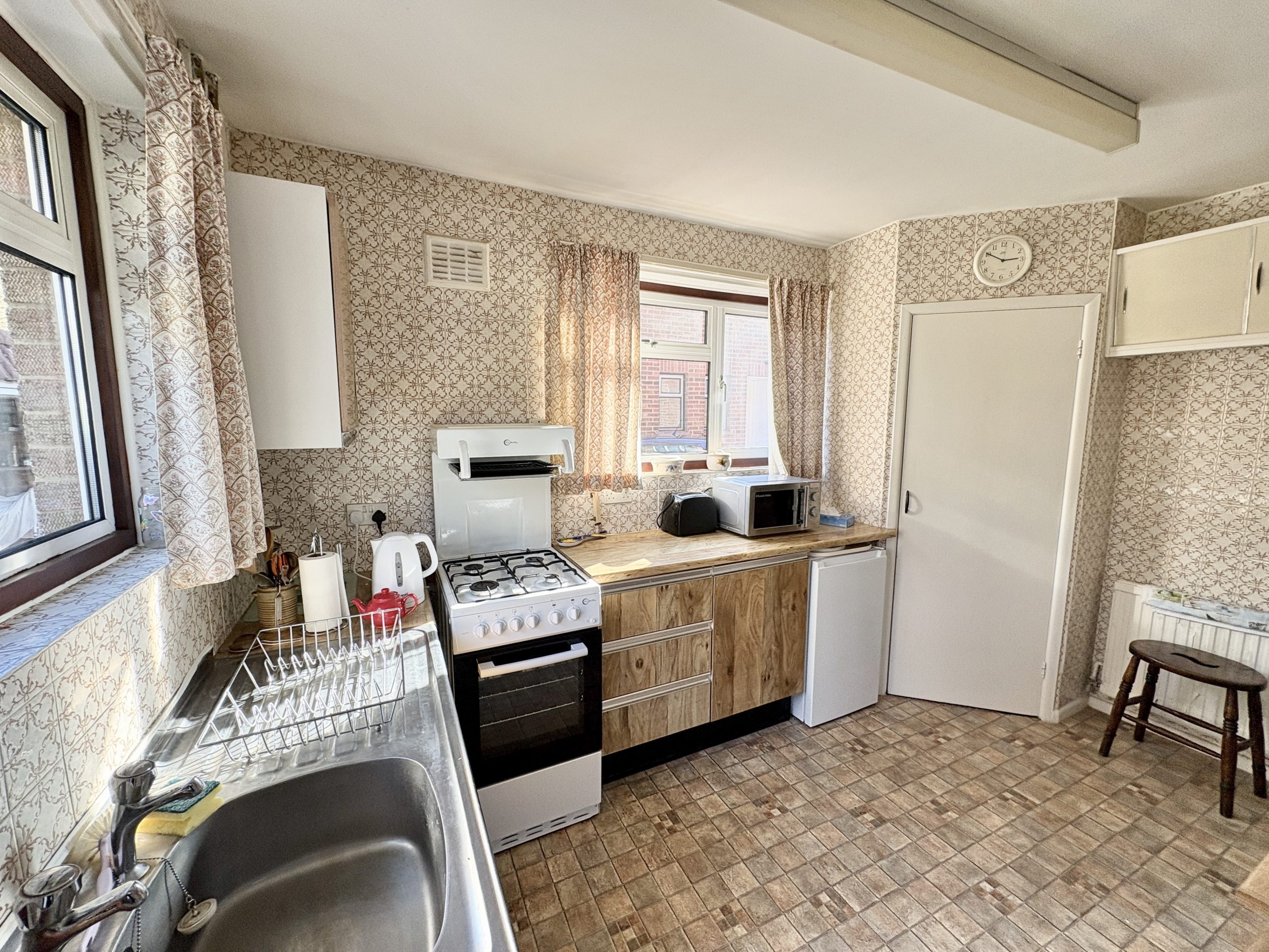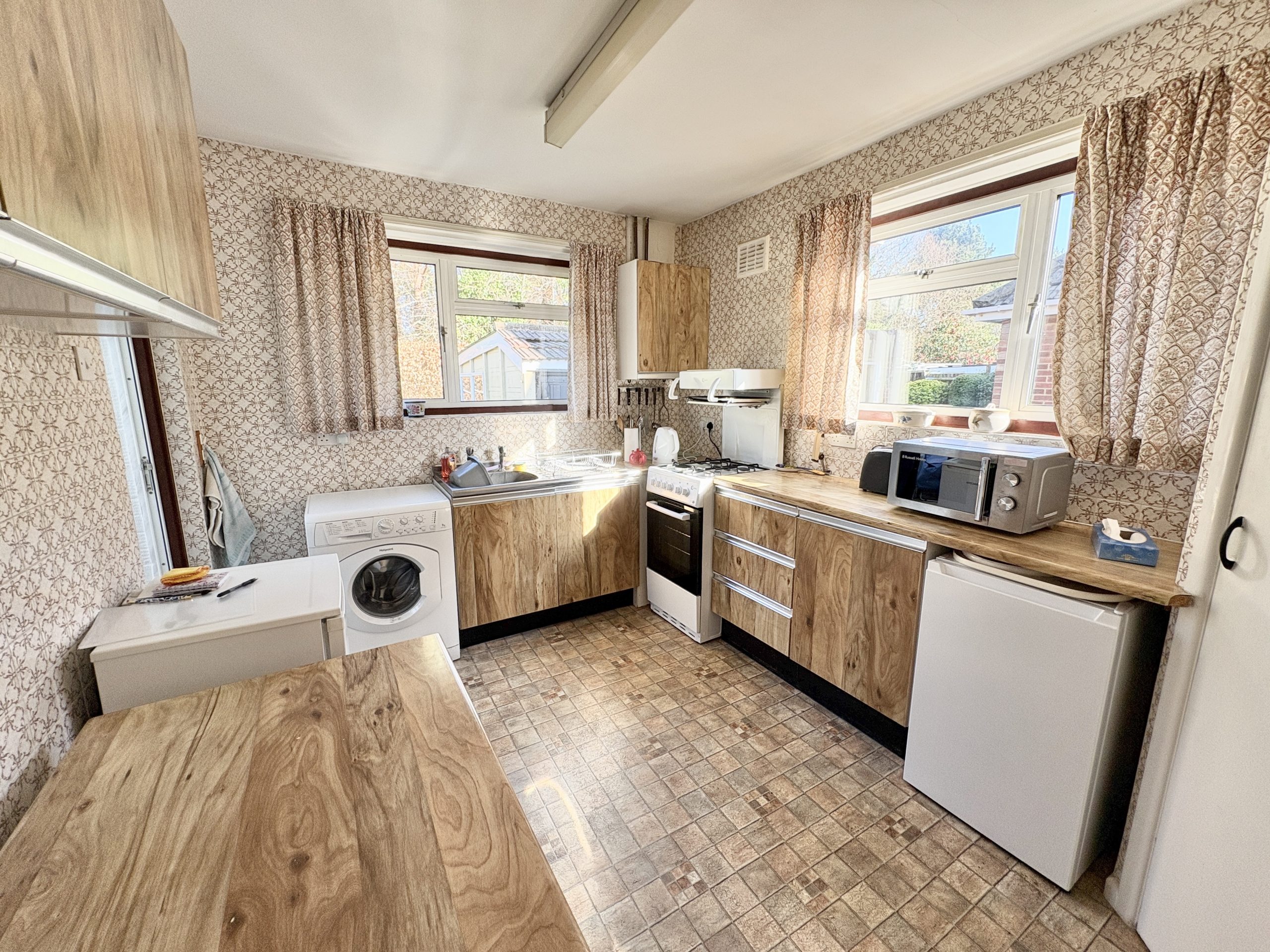11’11 (3.63m) x 8’11 (2.71m), Wall and floor units, worktops, sink and drainer, tiled walls, cooker, larder, Space for washing machine and fridge, cupboard housing gas fired boiler. Vinyl style flooring and door to;