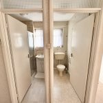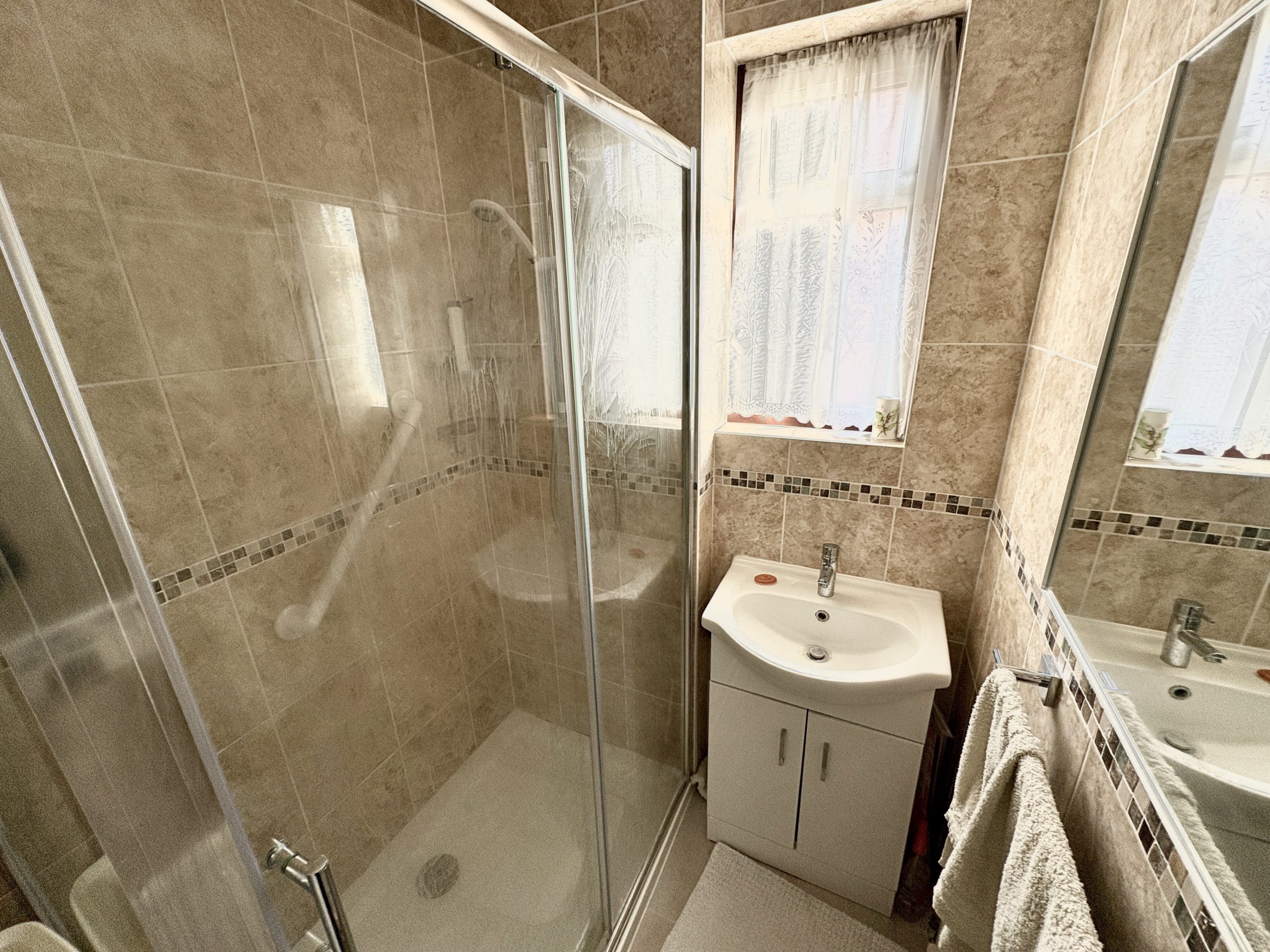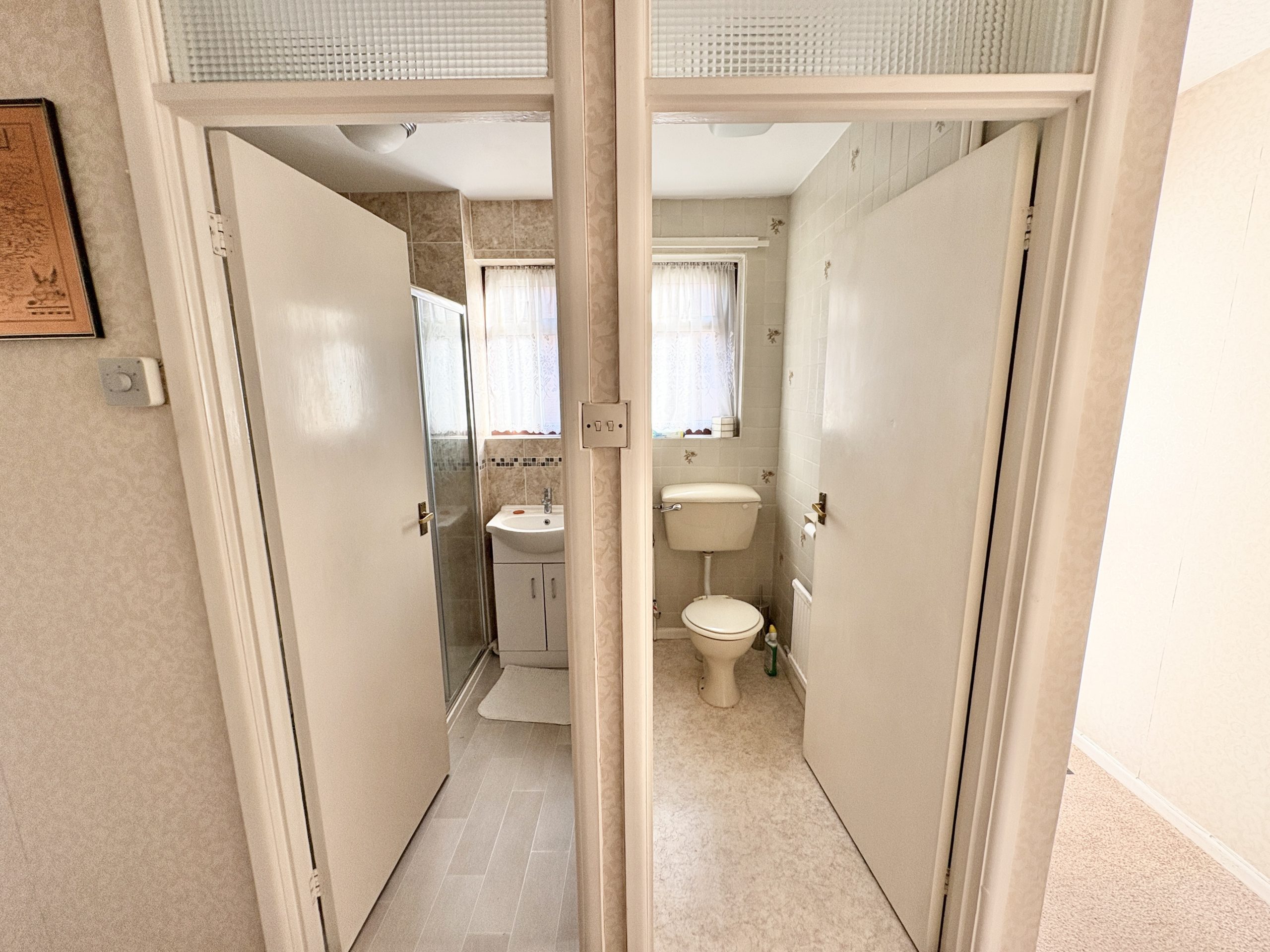 Shower, tiled walls, radiator. Separate cloakroom with WC with tiled walls, hand wash basin, vinyl style floor.